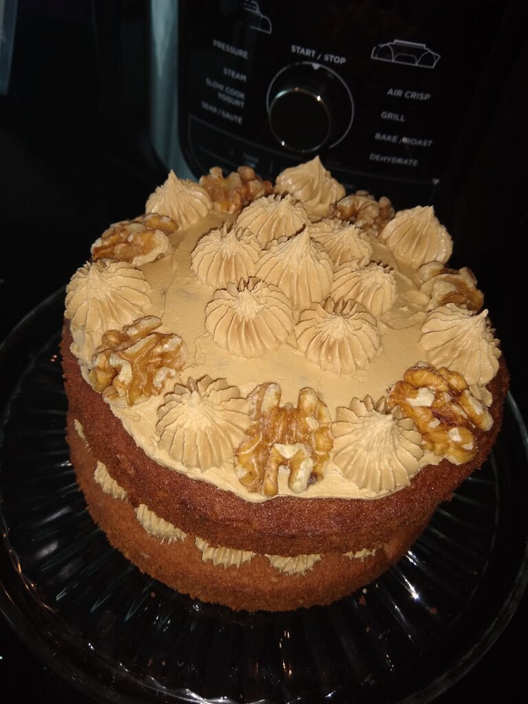 I used the Ninja 9 in 1 multicooker to bake the carrot cake, Bake setting, temp 155, 35mins or until the skewer is clean. I used one 6 inch springform …