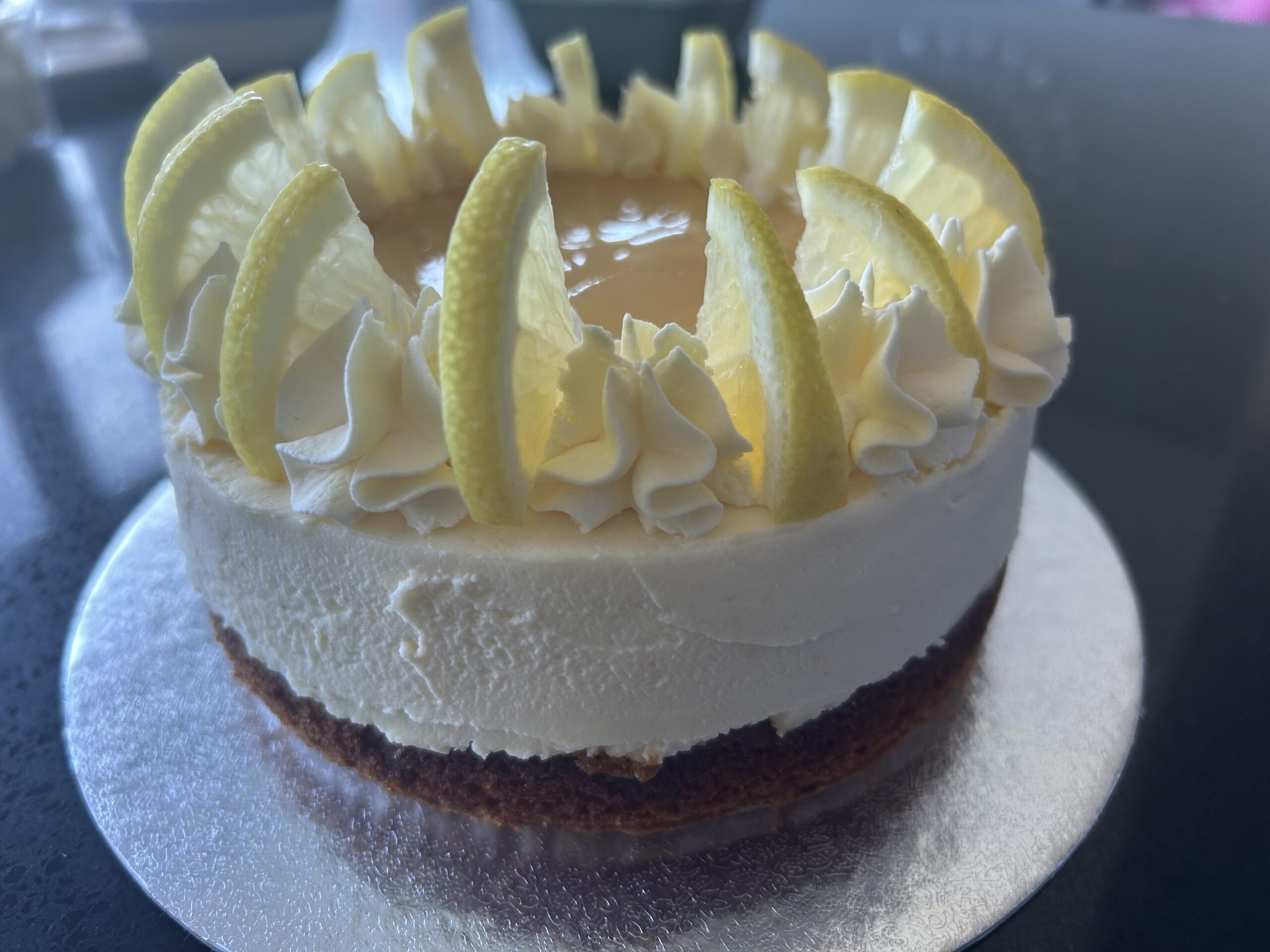 Loosen 2 to 3 tbsp of lemon curd and apply to the top of the cake. I do not add lemon curd to the edges so the cream will not slip.
